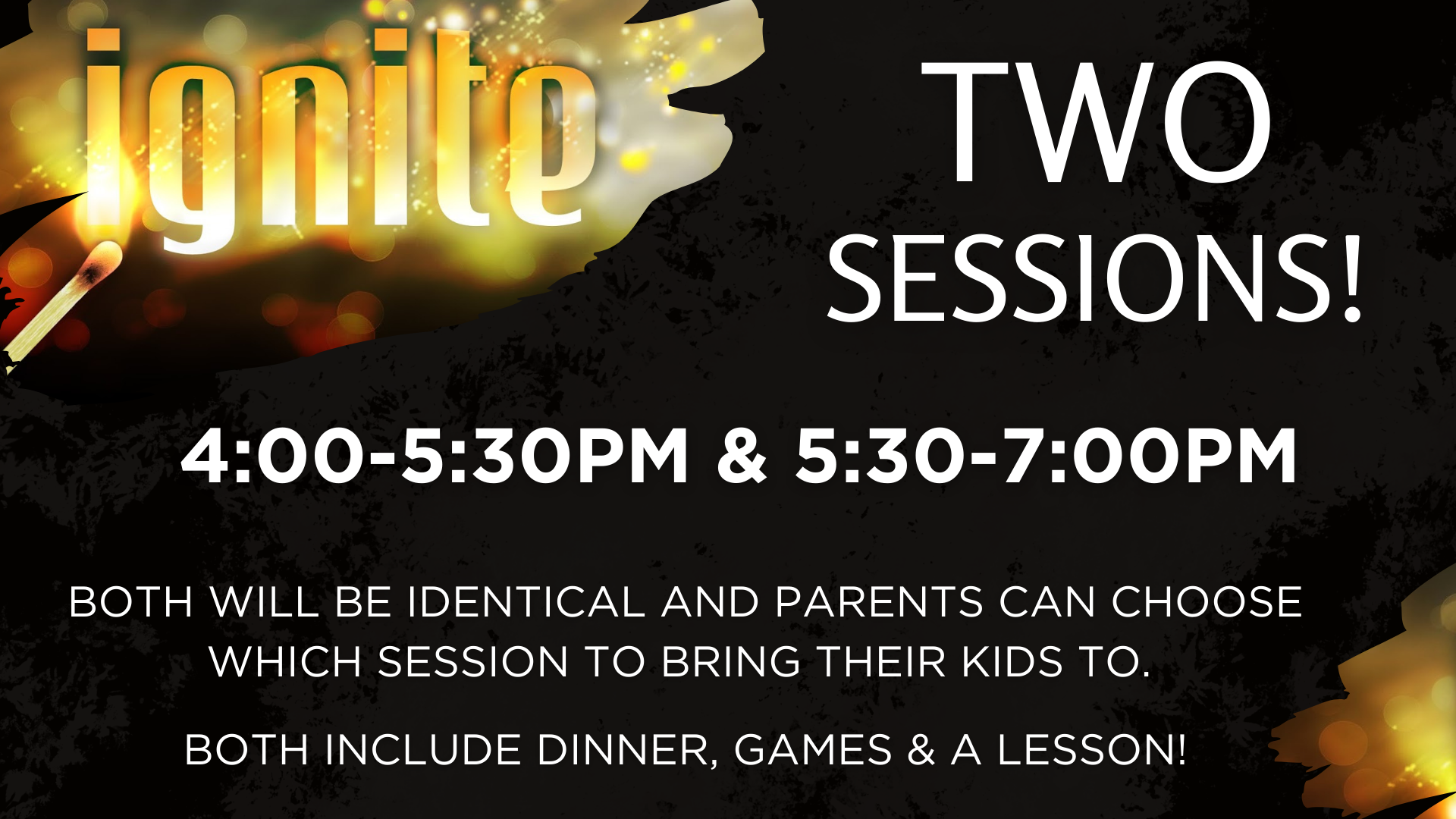 Ignite is our Sunday evening children’s ministry program. Ignite is an outreach ministry with an evangelistic feel. Ignite features a lesson, prayer, worship, activities, games and dinner!