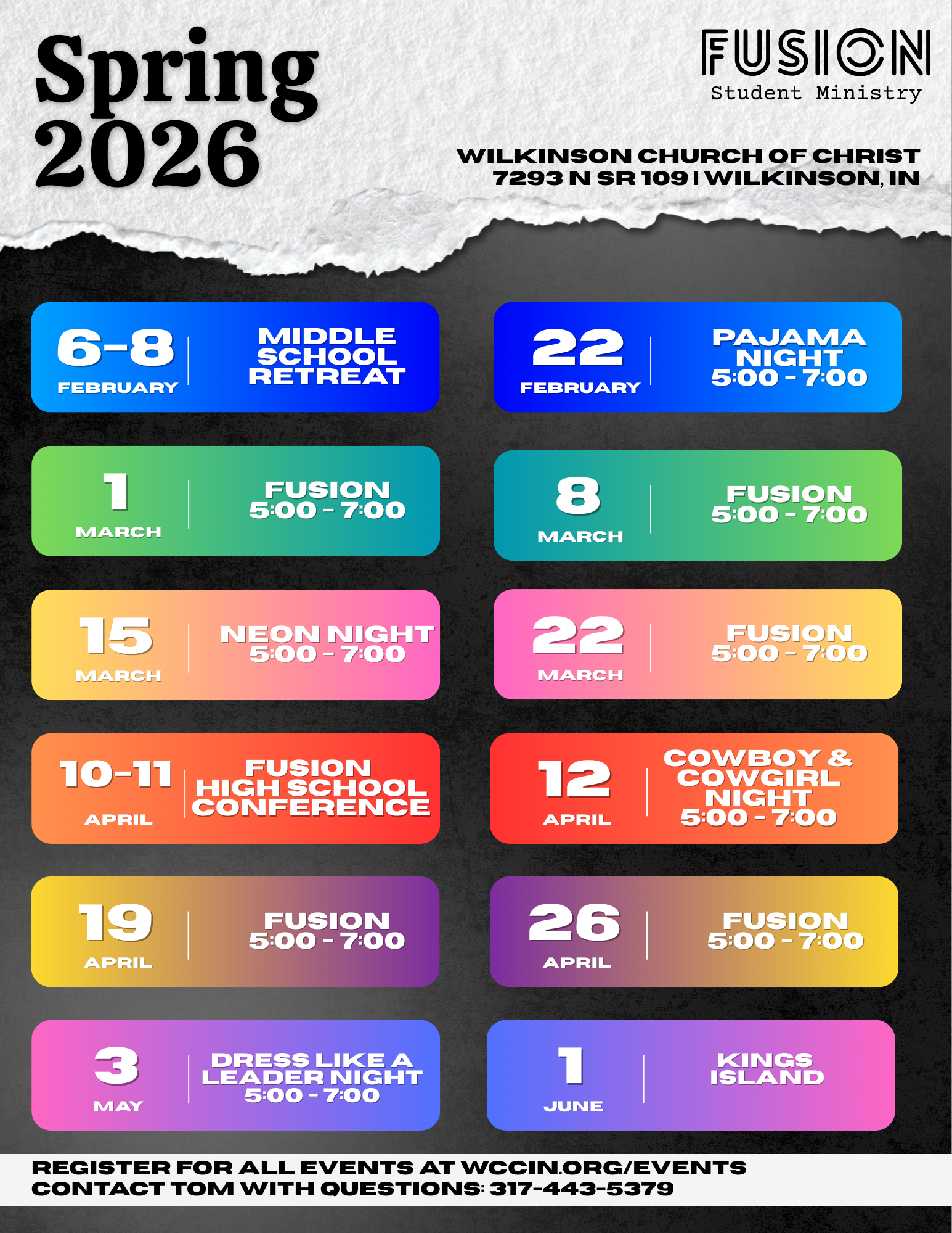 Fusion is the classic “Youth Group” at Wilkinson Church. Fusion meets Sunday Nights from 5:00 - 7:00pm in the Family Life Center. We have an optional hang out time beginning at 4:30pm. Join us for food, games and digging into God’s word!